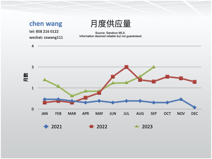 月度供应量指在目前的销售速度下市场上的房屋库存所需售出时间(以月为单位)。9/2023月度供应量为2.7个月,与8月份(2.1)相比增加了28.6%;与去年同期(1.8)相比增加了50%。圣地亚哥3-4个月的供应量被认为是平衡市场。低月度供应量推高房屋价格,高月度供量造成价格降低。