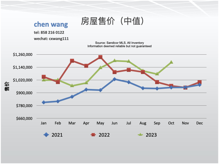 10/2023房屋销售价格中值(median)为1,185,000美元。与9月份相比(1,075,25美元)相比升高了10.2%;与去年同期相比(965,000美元)升高了22.8%。