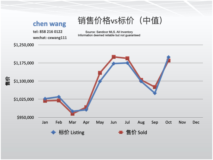 10/2023售价(sold price)低于标价(listing price)的1.7%,是本年份的第二次出现售价低于标价,第一次发生在3月份。9月份售价高于标价的2.5%。