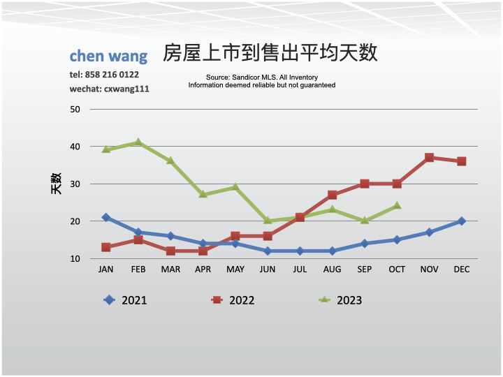 10/2023从上市到售出的平均(mean)时间为24天,与9月(20天)相比升高了20%;与去年同期(30天)相比下降了20%。
