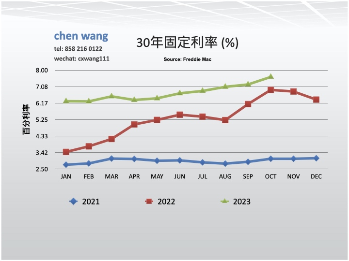 30年贷款利率10/2023为7.62%,与9月份(7.20%)相比升高了5.83%;与去年同期(6.9%)相比上升了10.43%。