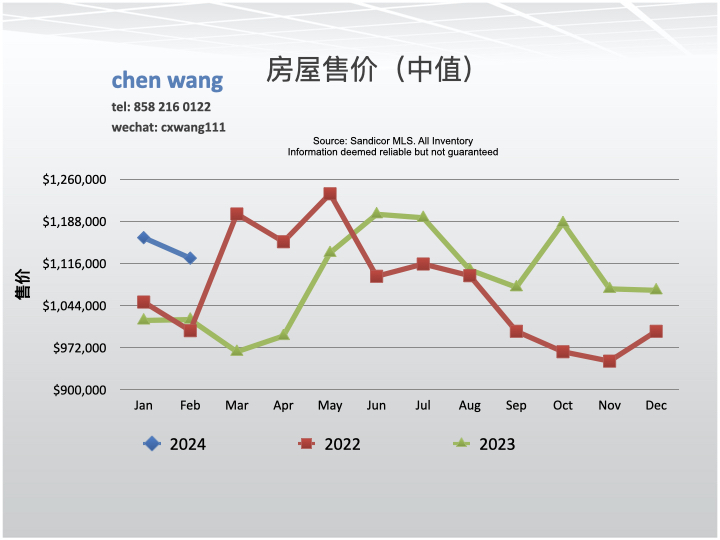 2/2024房屋销售价格中值(median)为1,125,000美元。与1月份相比(1,160,000美元)相比下降了3.0%;与去年同期相比(1,0208,000美元)升高了10.3%。