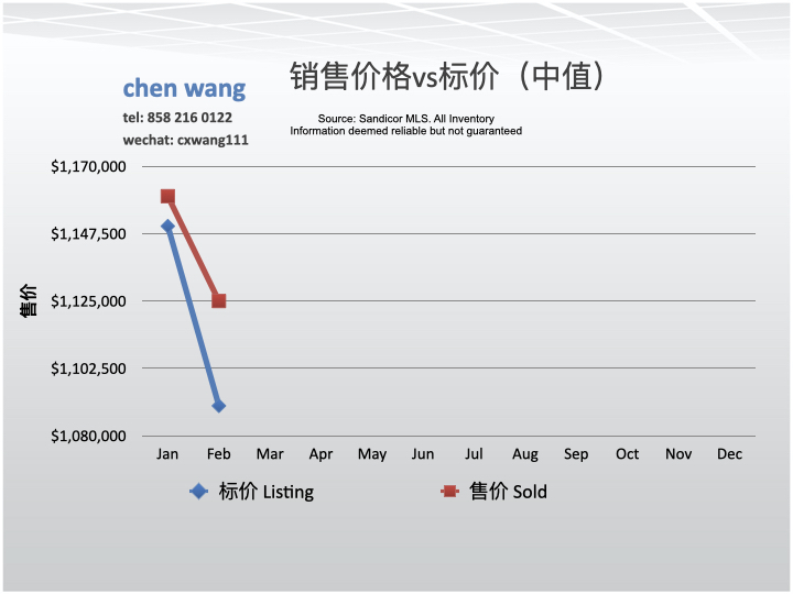 2/2024售价(sold price, 1,125,000美元)高于标价(listing price,1,090,000美元)的3.2%。1月份售价高于标价的0.9%。