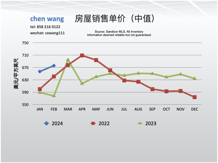 2/2024每平方英尺的价格(单价)为676美元。与1月份(657美元)相比升高了2.9%;与去年同期(641美元)相比上升了5.5%。
