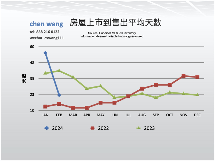 2/2024从上市到售出的平均(mean)时间为22天,与1月(55天)相比降低了60.0%;与去年同期(15天)相比升高了46.7%。