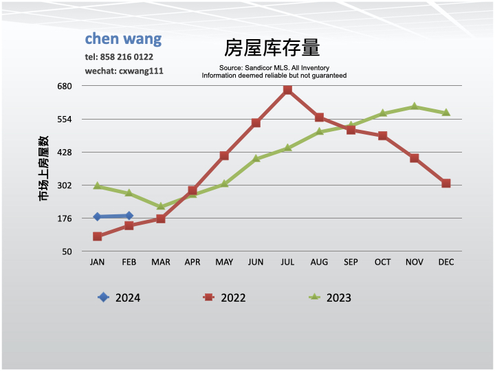 2/2024房屋销售数量为213套,与1月份(147)相比增加了了44.9%;与去年同期(257)相比减少了17.1%。本图和后面几个图红线代表2022年的数据,绿线代表2023年,蓝线代表2024年。