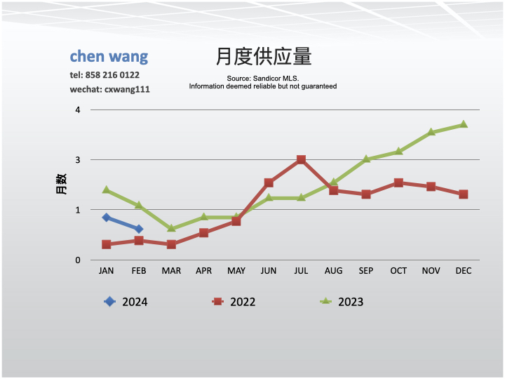 月度供应量指在目前的销售速度下市场上的房屋库存所需售出时间(以月为单位)。2/2024月度供应量为0.9个月,与1月份(1.2)相比下降了25.0%;与去年同期(0.6)相比下升高50.0%。圣地亚哥3-4个月的供应量被认为是平衡市场。低月度供应量推高房屋价格,高月度供量造成价格降低。
