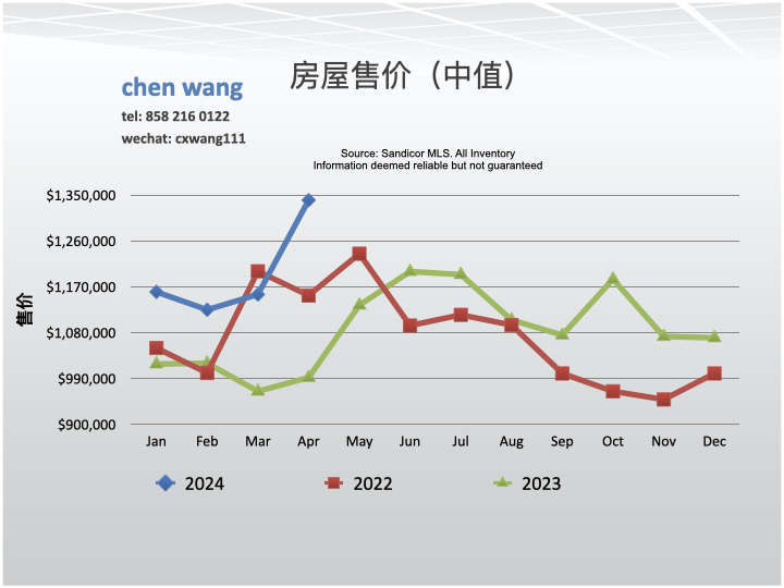 4/2024房屋销售价格中值(median)为1,340,000美元。与3月份相比(1,155,000美元)相比上升了16.0%;与去年同期相比(1,134,500美元)上升了18.2%。