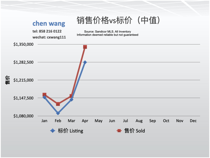 4/2024售价(sold price, 1,340,000美元)高于标价(listing price,1,282,000美元)的4.5% (58,000美元)。3月份售价高于标价的1.2%。