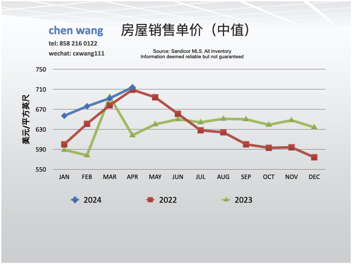 4/2024每平方英尺的价格(单价)为714美元。与3月份(692美元)相比升高了3.2%;与去年同期(618美元)相比上升了15.5%。