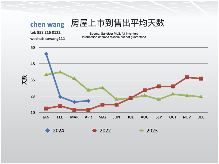 4/2024从上市到售出的平均(mean)时间为19天,与3月份(18天)相比升高了5.6%;与去年同期(27天)相比下降了29.6%。