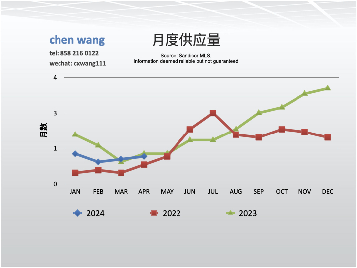 月度供应量指在目前的销售速度下市场上的房屋库存所需售出时间(以月为单位)。4/2024月度供应量为1.1个月,与3月份(1.0)相比升高了10.0%;与去年同期(1.2)相比降低了8.3%。圣地亚哥3-4个月的供应量被认为是平衡市场。低月度供应量推高房屋价格,高月度供量造成价格降低。