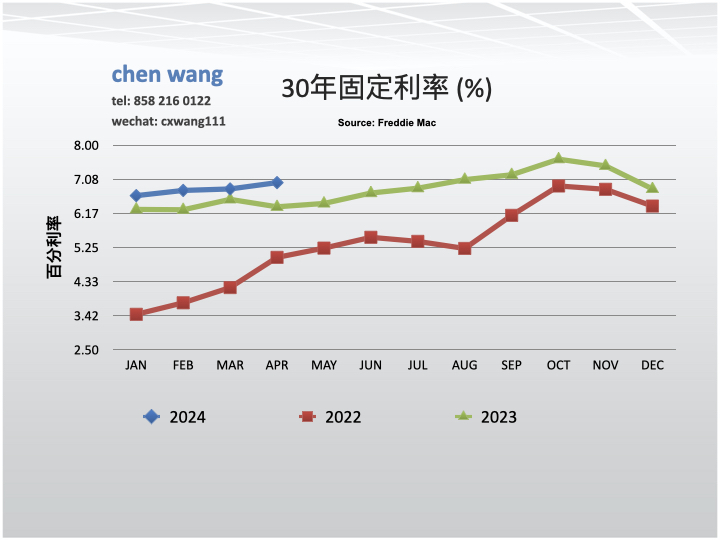 30年贷款利率4/2024为6.99%,与3月份(6.82%)相比升高了2.49%;与去年同期(6.34%)相比上升了10.25%。