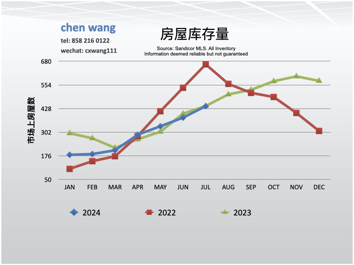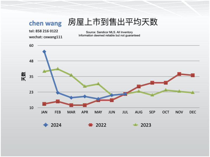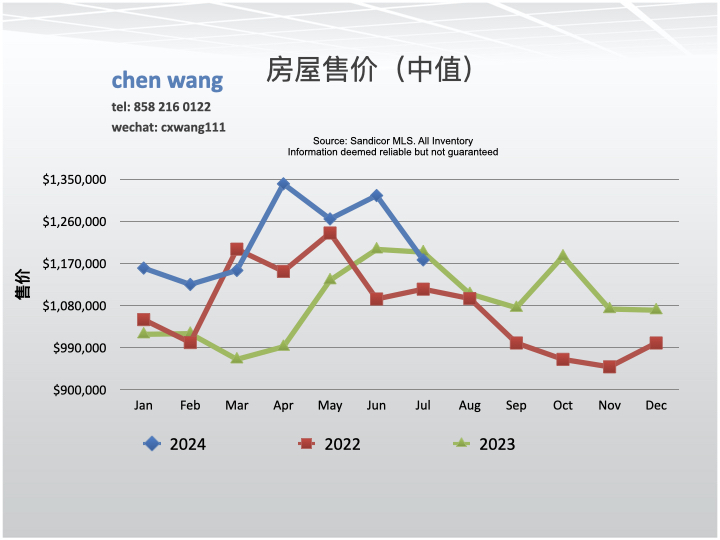 2024年7月份,圣地亚哥市56高速走廊地区的房屋销售价格比6月份下降了10.5%,比去年同期下降了1.4%;圣地亚哥县房价比6月份下降了3.2%,比去年同期升高了5.7%。7月份售价低于标价的1.8%,是今年以来第一出现的售价低于标价。