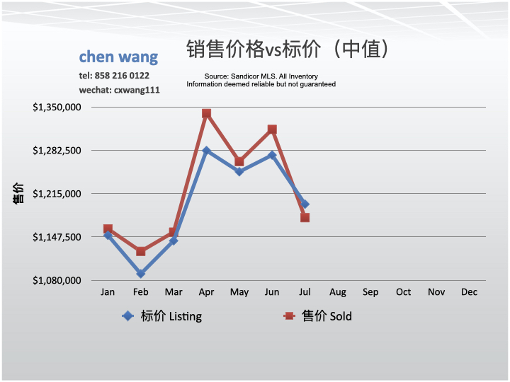 7/2024售价(sold price, 1,177,500美元)低于标价(listing price,1,198,500美元)的1.8% (21,000美元)。6月份售价高于标价的3.1%(40,000美元)。