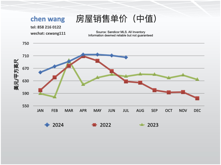 7/2024每平方英尺的价格(单价)为705美元。与6月份(711美元)降低了0.8%;与去年同期(644美元)相比上升了9.5%。