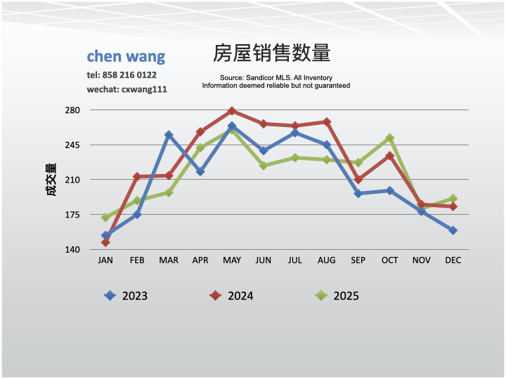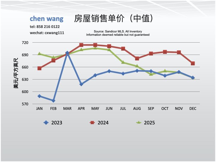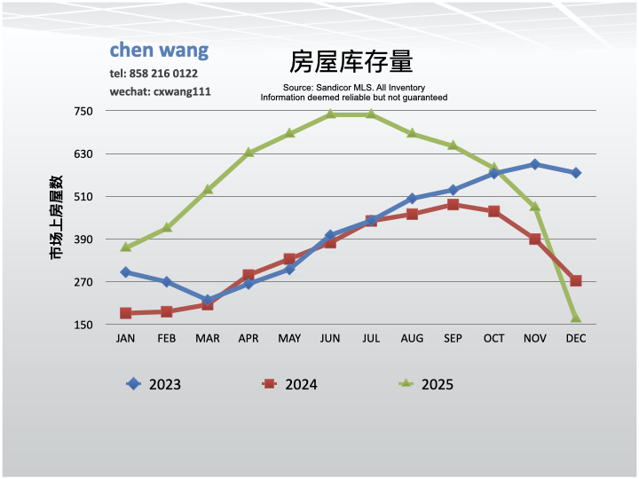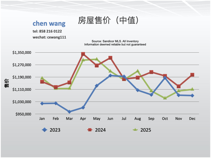 2025年12月份圣地亚哥市北部区域房价与11月份相比略有升高,然而与去年同期相比有所下降。虽然售数量略有升高,但库存量大幅下降说明上市数量的减少。从2023,2024和2025的价格曲线来看房价每年3-4月份开始升高,5-6份价格达到最高峰。