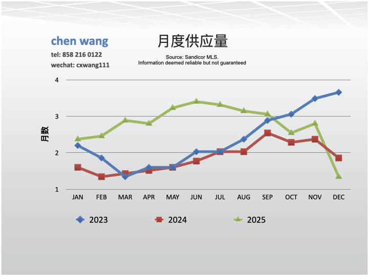 月度供应量指在目前的销售速度下市场上的房屋库存所需售出时间(以月为单位)。12/2025月度供应量为0.9个月,与11月份(2.6)相比下跌了65.4%;与去年同期(1.5)相比下跌了40%。低月度供应量推高房屋价格,高月度供量造成价格降低。圣地亚哥3-4个月被认为平衡市场。