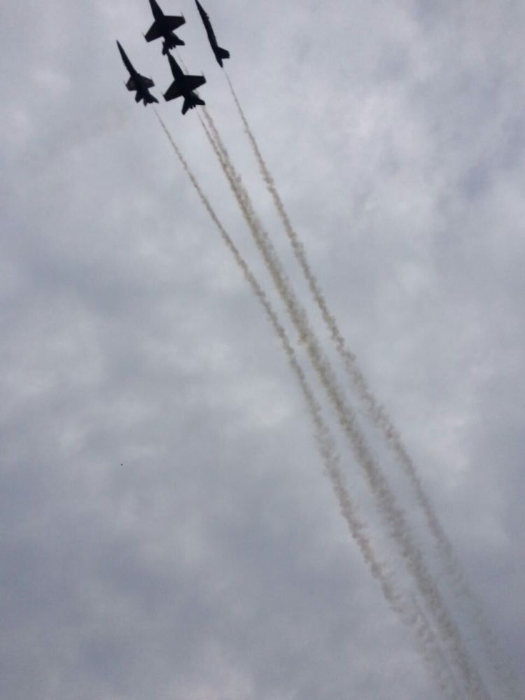 飞行员就更加辉煌了。空中倒置, 以机身的长轴为轴360度快速旋转,侧飞的横圆和掠地而起的竖圆,四机的钻石方阵,二机的上下镜影对称,还有“空中开花”,四架飞机从离地很近处同时垂直快速直插高空后像花瓣状的向四周开放,扯出如花的长长的白线。蓝天使的速度是极快的,最快可以飞到1400mile/小时(在今天的表演中,它们最快是以500 mile/小时飞过的),所以把这么大能量的家伙开的极慢也不是一件容易的事。当两位天使以120mile/小时的慢速度手拉手从我们眼前漫步而过时,我的心都跳不动了,只有敬佩敬佩还是敬佩!挨的如此之近,不会擦伤吧!蓝天使们除了帅气,英武,和胸有成竹的自信外,偶尔也小露幽默,给大家逗个乐。当观众全神贯注地注视着正前方的战机的潇洒表演时,忽然右边嗖的一声不知从哪里就飞来一天使,擦耳呼啸而过,惊的我大叫一声,一把紧紧地抓住领导的手臂,还没等反应过来,左边又是一声轰响以迅雷之势从另一耳边划过,我本能地拉着领导就蹲在了草地上。被结结实实地给吓了一大跳的同时,就发现我居然有电影里军人遇到危险就卧倒和保护领导的本能,难怪从小就爱当兵。哈哈!此时此刻我完全被飞行员的精湛配合所折服了,这里展示的不仅仅是个人的技能,更重要是团队的配合!在远离地面几千米的高空里,在如此快速的行进之中,分秒不差的默契和千变万化的队形变换实际上是对战友无条件的信赖和负责,这是一件多么不容易的事情啊!在这样的信任里,在这样的精湛中,高高的蓝天不过就是一个巨大的已被掌控的舞台,不再神秘,不再桀骜,仿佛它的存在就是为了让蓝天使们在其中随心所欲地自由翱翔和精准驰骋!