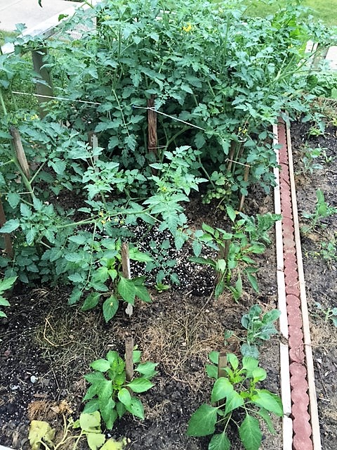 图3,西红柿和辣椒, 能看到一棵瓜苗在枯死。