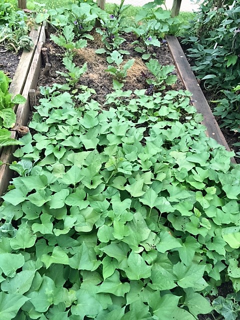 图4,红薯,茄子和红苋菜。苋菜已把主心摘去,以便更发多的枝。