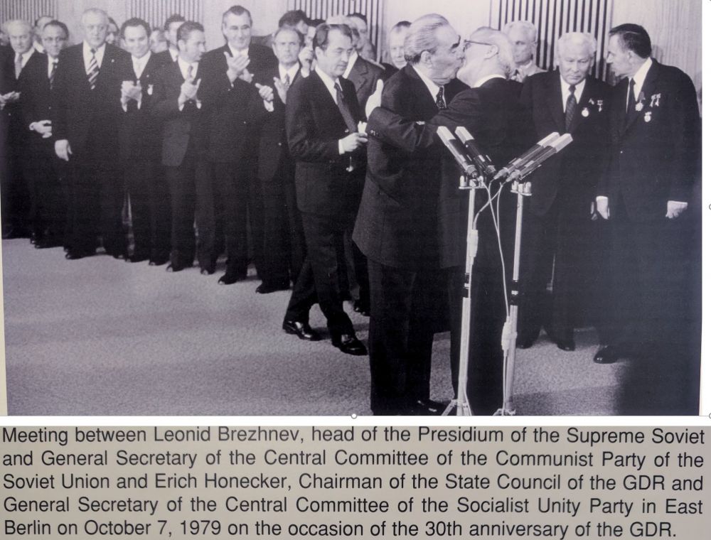 另一幅被LG称为最恶心的画,是俄罗斯艺术家德米特里·弗鲁贝尔(Dmitri Vrubel)创作的《我的上帝,帮我活下去,在这致命的爱中》。初见这幅画以为它是艺术家的夸张讥讽和幽默,后来去了东西德边境著名的查理检查哨的博物馆,才知道这幅画原来是基于真实的历史镜头“德苏兄弟之吻”的艺术再现—苏联领导人勃列日涅夫(Leonid Brezhnev)与东德领导人霍内克(Erich Honecker)于1979年在东德建国30周年庆典上行“社会主义兄弟之吻”(苏共国家间的一种正式礼节性亲吻)。深情的接吻,看着令人作呕。这并非亲密的象征,而是政治依附与压迫的隐喻。“致命的爱”这四字,说尽了一个小国在强邻之下的无奈与自嘲。
