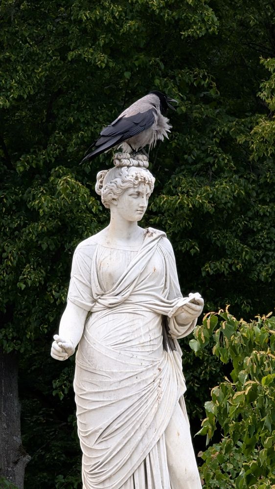 在这些墙后面的草地上,我第一次看见了这种灰黑相间的鸟,回来给儿子看照片,他说象是鸽子和乌鸦的混血。从网上查了,它叫灰乌鸦,还有一个好听的名字叫冠蓝鸦(Hooded Crow),是欧洲北部常见的鸟种。感觉它不像鸽子那么友好,也不像乌鸦那么阴险。它傲然地站在草丛中,一动不动,却气场十足。