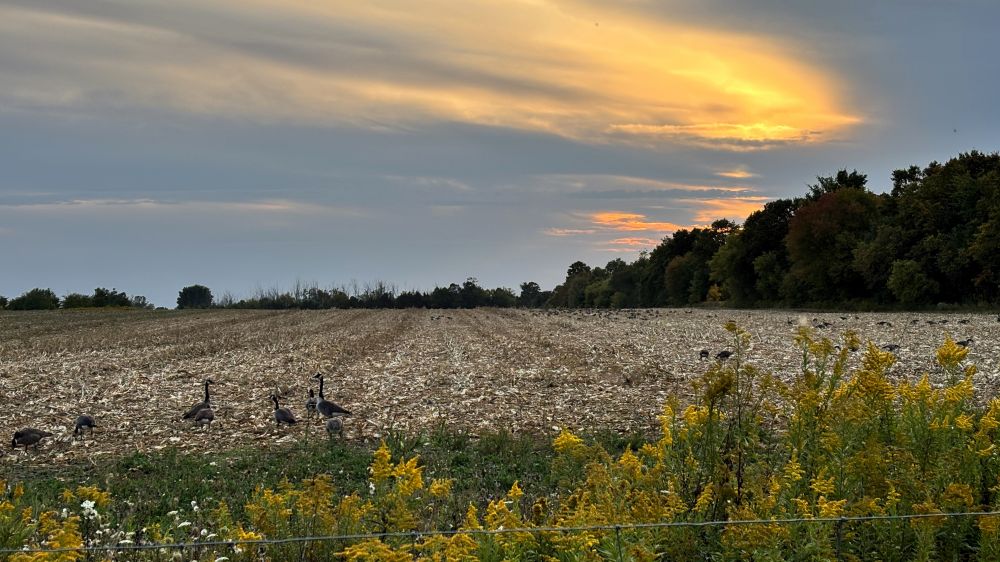 收割过的玉米秸上,成群的加拿大鹅在尽情地享受着晚餐。