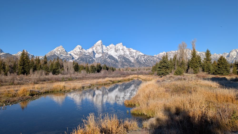 沿公路进入 Moose Entrance,我们的第一站是 Schwabacher's Landing。蛇河静静流淌,雪山在水中投下冷峻倒影。除了几只野鸭滑行其上,并无其他野生动物的踪影,但这份宁静本身已足够动人。
