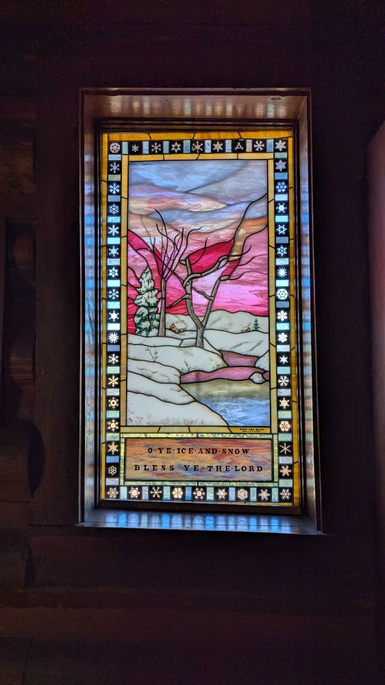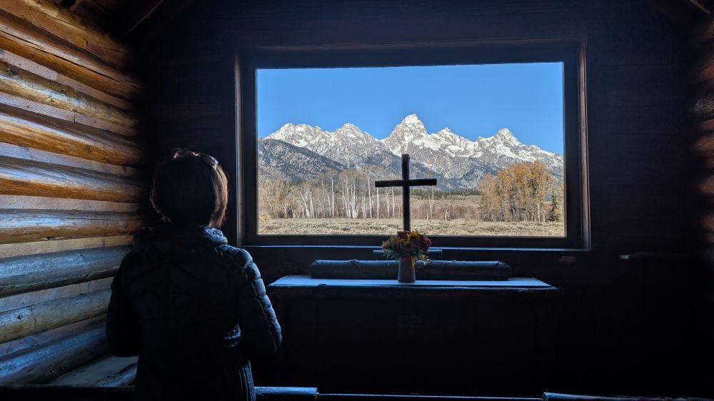 教堂门口贴着一张暖心的告示,“教堂开放,请进来祈祷。”透过祭坛后的窗户,正好望见巍峨的提顿山脉——仿佛整个自然都成了祈祷的背景。