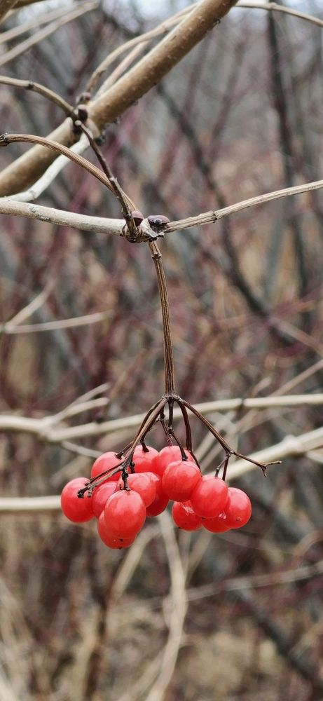 林间的颜色在这个季节显得格外清晰。忽然,一簇亮红的浆果在枝头闪着光,鲜艳得像画里的点睛一笔,让这幅初冬的色调瞬间亮了一下。