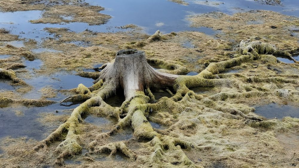 湖水退去了许多。和夏天比起来,水位低了很大一截。原本平静深邃的湖面突然露出许多被隐藏的痕迹:粗大的树根散落在湖床上,象时间遗留下来的骨骼,悄悄讲述着这里的故事。这是我今天最意外的发现——原来大湖的下面曾经也是一片森林!