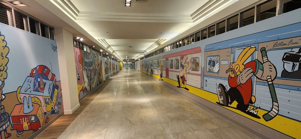 回程路线熟了,只花了半小时。快到的时候经过一段通道,墙面被画成一列正在行驶的地铁,通勤者化身为漫画人物,非常有幽默感和温度。