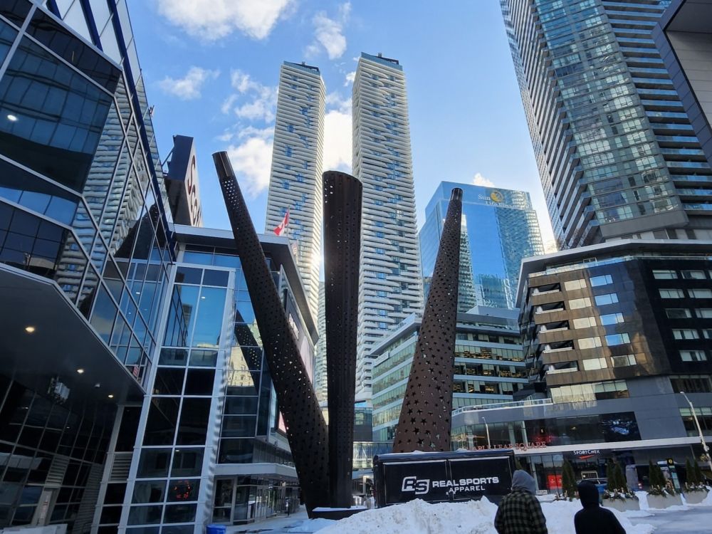 前面的公共雕塑《Rising Thrust》,由加拿大艺术家 Ron Baird 创作。作品以向上伸展的耐候钢结构构成,钢板上镂空的枫叶图案象征加拿大的身份与精神。雕塑整体呈现出一种破土而出的力量感,呼应周围不断生长的城市天际线,寓意多伦多的活力、进取与持续上升的城市能量。