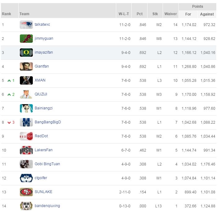 娘子赛前预测分有120多,但是除了帅哥QB MM表现惊艳,得了将近36分,其余所有队员表现疲软,所幸对手疯子无心恋战,娘子拿下宝贵的一分,得以继续冲击季后赛。