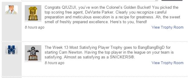 恭喜求大夫再次上榜, 希望联赛结束后, 一定要公布谁是你的幕后教练,这挑人排阵的本领真是没得说。富康QB Newton 再次为富康夺得一座奖杯,其实这次得30多分的QB实在多,象娘子的MM,司令的大奔,鸭子的RW,疯子的Blake Bortles。