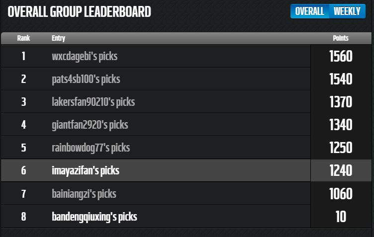 本周排名没有大的变动,逃课吉米锁定前2名,鸭子巨饭锁定3,4名。吉米平了逃课8连胜的记录. 余下有5支7胜的球队将在下一轮决出谁能抢到最后两张门票,其中叉子和求大夫将要火拼,输的肯定出局,赢的能不能进级还要看湖饭领导制定的是什么制度,湖饭大概做梦都没想到有如此结果。