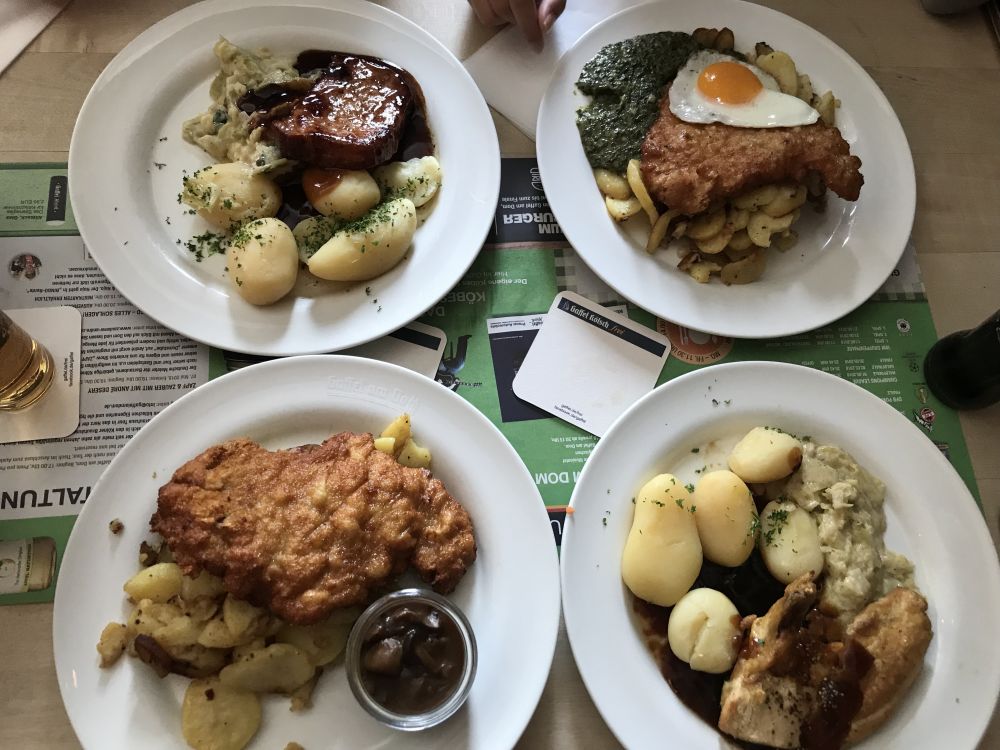 德国人吃饭不讲究太细腻,不像法国人有些娇情。炸猪排,煎鸡块,吃起来豪爽顶饱。只是也有小陷阱,不管是饮料还是啤酒,端上来时下面还有一个小垫子,温馨可人。其实里面有门道,服务员看到你的饮品快见底时,立即会送上另一瓶开盖的,别高兴,不是在美国快餐店吃饭,饮料可以免费refill。一小瓶可乐收费2.5欧元。直到你把那个小垫子放在杯子上 面,你才会被停止强迫消费。德国人也够狡黠的,专坑外地游客。这让我想起陕西农村请客吃臊子面,你要是把筷子放在空碗上,你的吃饭家伙事就会被人收走,因为那表示你已经吃饱啦。你总不能当着那么多人面吆喝:鹅还没吃饱咧。