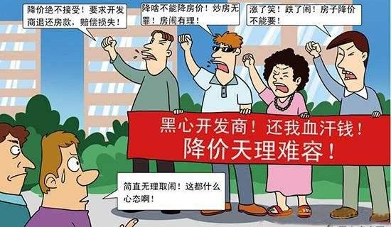 三个月前付两万买一平米的房,现在卖一万七,不行,我得把差价要回来。我们这个社会除了法律强制外,还有很多契约和公理规范人们的行为,才保障了社会的相对稳定。说的平白点儿,这个相对稳定的社会是由许多小的平衡体系维护着, 小的平衡体系又一环套着一环。你也许没有义务去维护这种平衡,你也不把公理放在眼里,但你的行为还是要受契约约束的。到房地产公司“维权”,标语上的字写的再大都没用,想不通就干脆到法院起诉,看胜算几何。想得通就自认这个“不公平”,谁让你眼浊当初在买房合同上签字呢。为什么不等到降价时再买呢?说来说去还是你自己的问题。