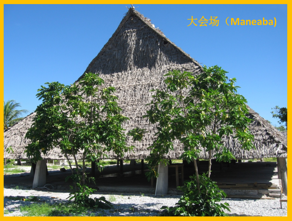 这是个可以容纳几百个人的大型开放式建筑,A字型的茅草屋顶大约有30英尺高。四周没有墙。除了支撑着屋顶的混凝土柱子和下面的水泥地板,整个建筑是由椰子树干,椰子树叶,和椰子皮(husk)编织的麻绳建成的。