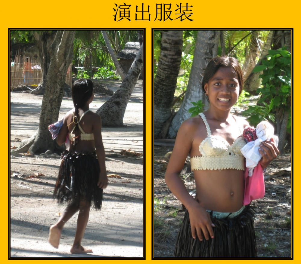 天气相当热,我坐在地上不动,也是大汗淋漓的。然而,舞者们无视脸上和身上不停地流淌的汗水,完全沉浸在音乐和舞蹈之中。有一个女孩子,一边跳舞,一边在哭泣。我们问图布基她是否有什么伤心的事,他说,她是被这优美的音乐所感动,控制不住情绪而哭泣。图布基还告诉我们,老派的基里巴斯人把音乐和舞蹈作为一种神圣的活动,传统词曲的创作灵感来自神和魔法。
