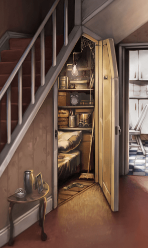 哈利在姨家从襁褓长到10岁,整天挨骂受欺,睡在楼梯下的柜子里 (Cupboard),与蜘蛛 Spiders结伴,穿的是表哥的肥衣破裤。 怪事时时发生在哈利身边, 一天,姨妈用剪刀给他剪个秃子,第二天头发回生复原。一天,姨妈强把他头塞进表哥的旧套头衫, 结果衣领越来越小,缩到巴掌大木偶才能进。一天,表哥结帮追打他,他猛跑啊,奇怪居然飞到学校烟筒顶上!表哥过生日,全家去动物园,今天别出事。 哈利在看蛇, 竟然蛇跟他挤眉眯眼,还能听懂他的自言自语,表哥冲过来推倒哈利,抢看蛇, 这时玻璃消失, 蛇扒了出来,走出动物园!