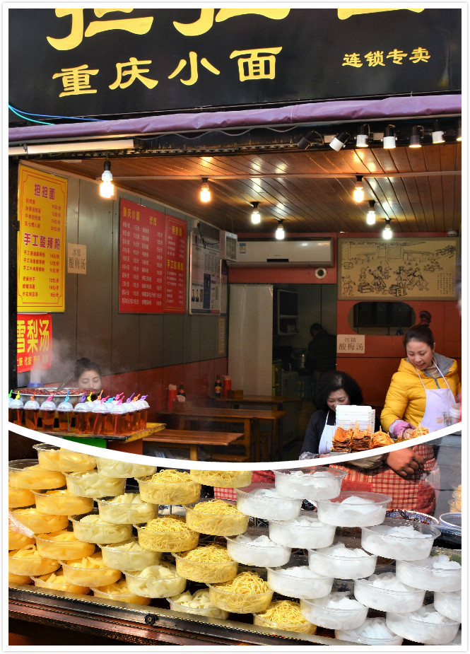 这里聚集了丰富的重庆小吃。窄窄的街道,两边是一溜溜的小吃店。