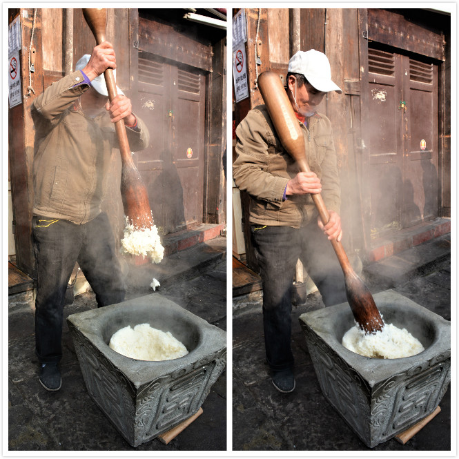 砸糍粑面,是个力气活。