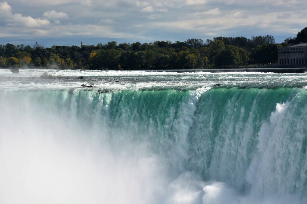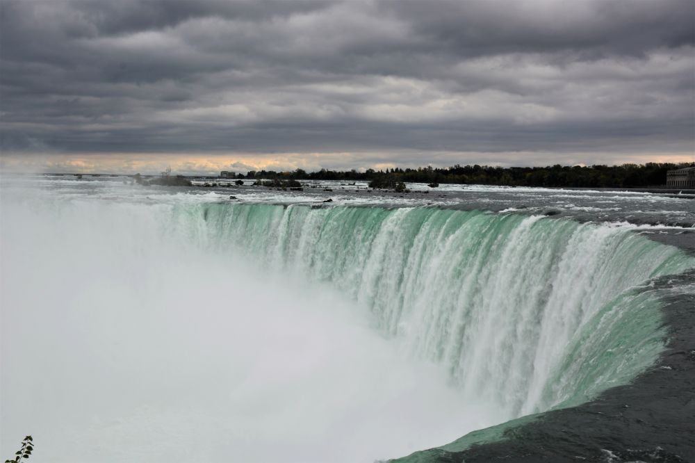 宽阔的尼亚加拉河水汇聚到狭窄的马蹄形瀑布,奔泻而下,激起冲天的水雾。