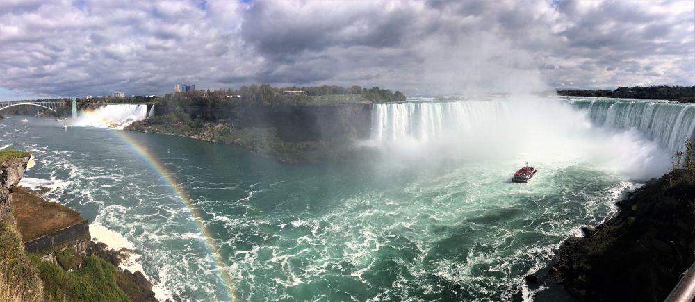 下午3点多钟,太阳从云层后边出来了。水雾在太阳的映照下,一道彩虹挂在尼亚加拉河上空,斜跨过彩虹桥——彩虹桥的名称应该就是这么来的吧。