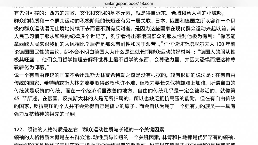 3. 群体运动的成因和下面这些因素有关:民族性,基因,传统,时间,和智力无关。“所以说,在任何一个国家中,任何一个当选领袖的意见,都会反映着这个民族的禀性,而我们看到,这种禀性从一代人到下一代人,世世代代地流传下去,从来都不会出现显著的变化。”书里说法国人,拉美人容易丧失理智。而英国这样就比较理智。里面还说道中国: