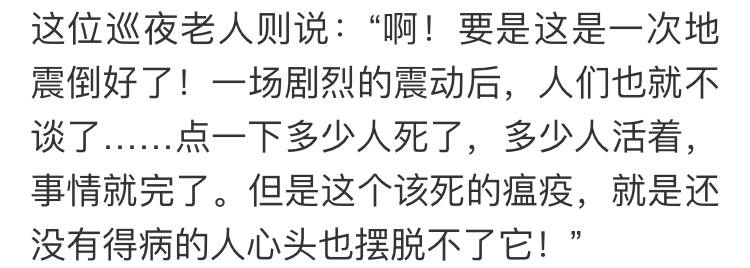 加缪写这本书原本是影射崛起的法西斯主义。然而他描写的都太写实了,即使今天看也全部吻合。历史只是重合,因为我们前进的路上一直被human nature,被人性弱点所束缚。就连疫情一开始的拒绝承认都如出一辙。还有昨天看的电影,出了事首先想掩盖,都是共性。最后还是要靠道德,靠制度,靠媒体监督。