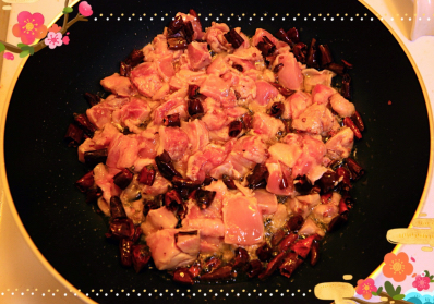 8、辣椒面炒出红色,鸡丁8、9成熟时下入葱、姜、蒜片翻炒;