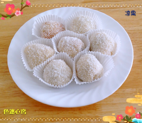 老婆不是很喜欢黄豆粉,而喜爱椰蓉,所以,又做了一些改进的“驴打滚”,我称其为“凉果”:是用椰蓉代替黄豆粉,另外是将红豆沙包在糯米面的里面,像包汤圆似的。为配合椰蓉的甜香,和面的时候用适当的牛奶替代水,并加入少量的白糖,这样吃起来椰香、奶香浓郁,香甜适口。